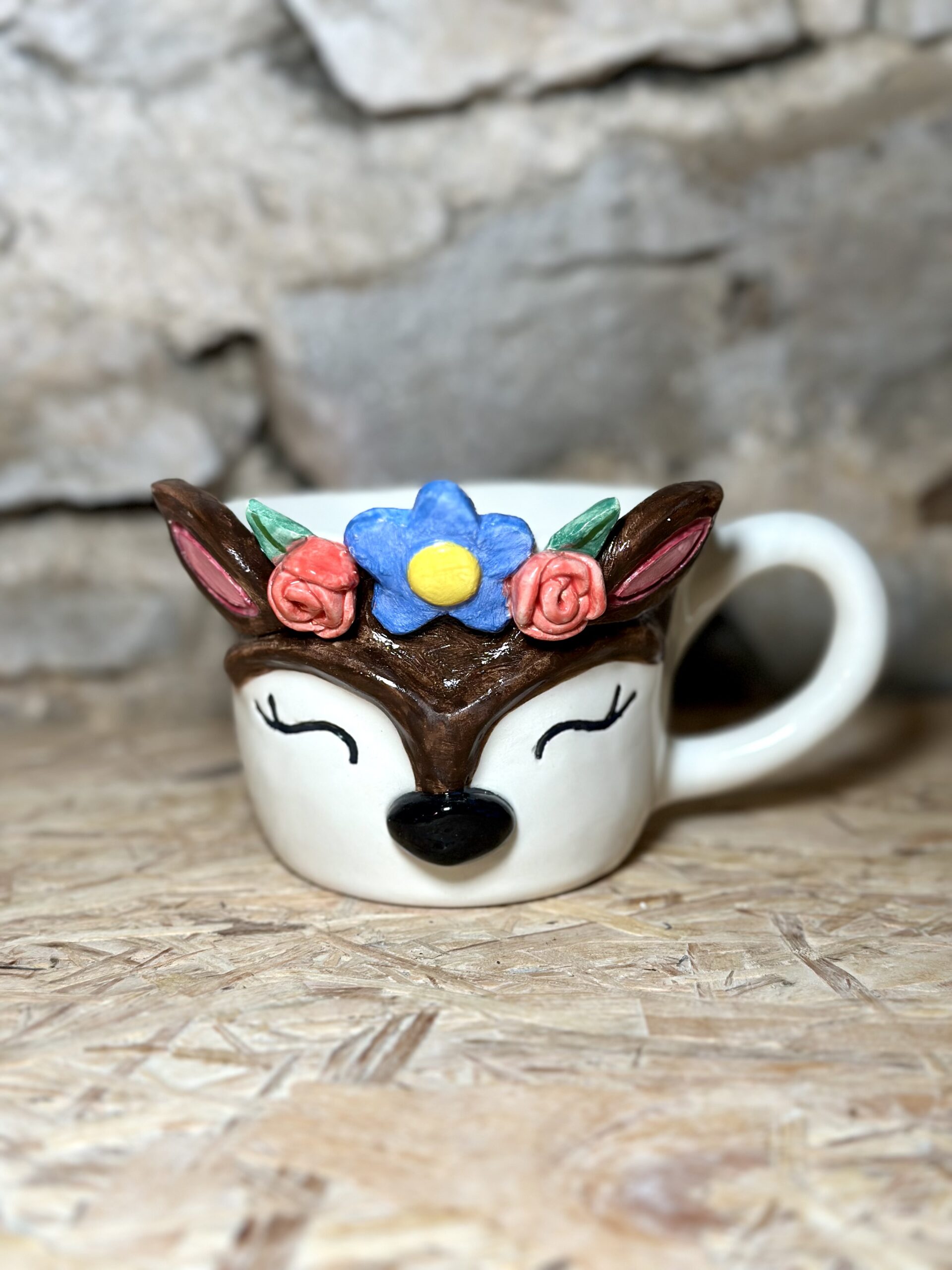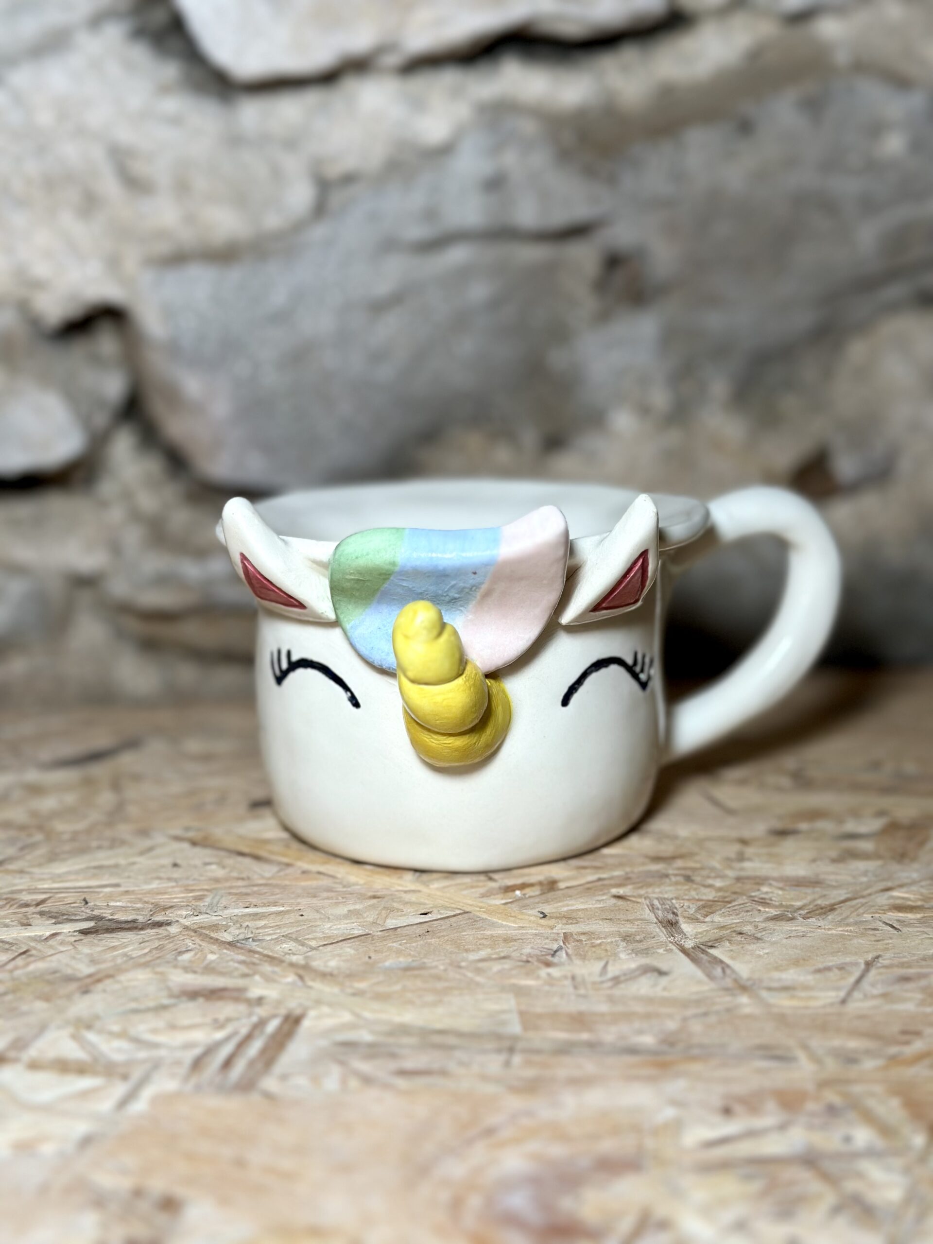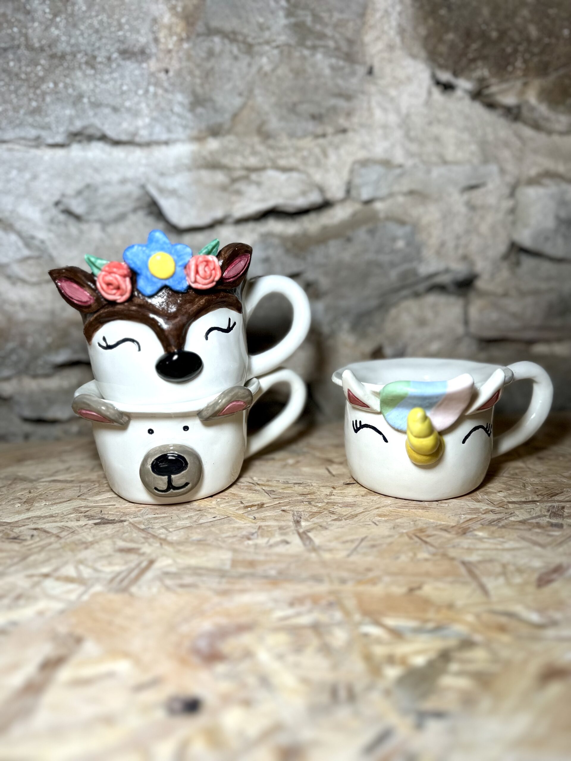 Chaque tasse met en scène un animal en relief, façonné avec soin et délicatesse : une biche douce et poétique, une licorne rêveuse et un ours attendrissant. Chacune possède sa propre expression, ses formes et ses couleurs, laissant parler l’enfant intérieur et apportant une touche de joie simple au quotidien.