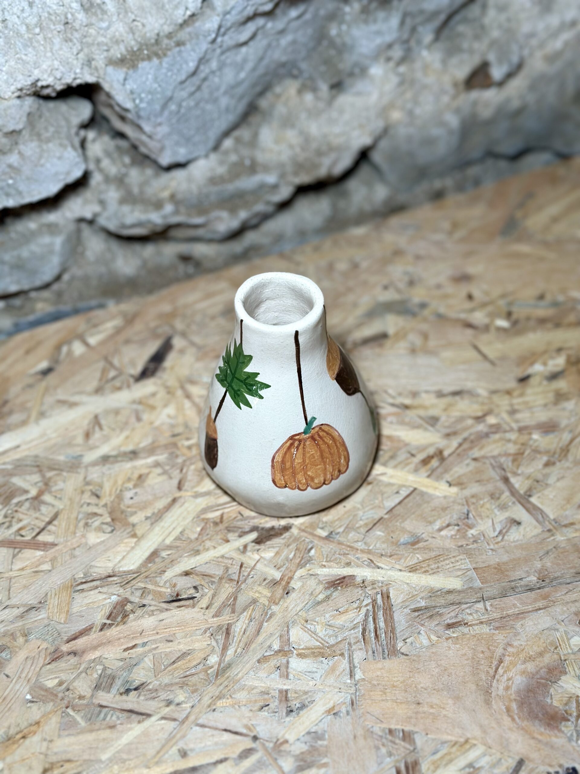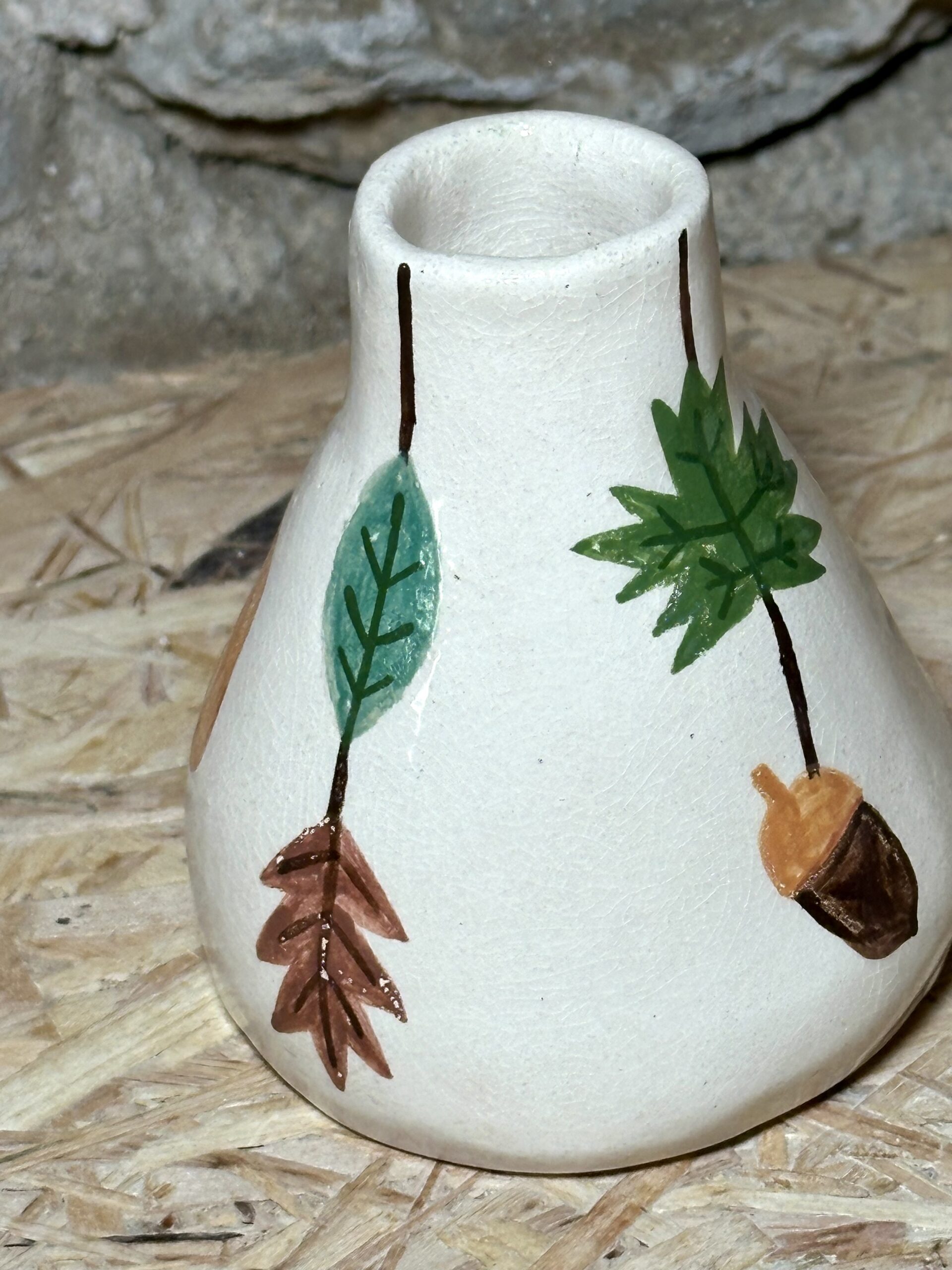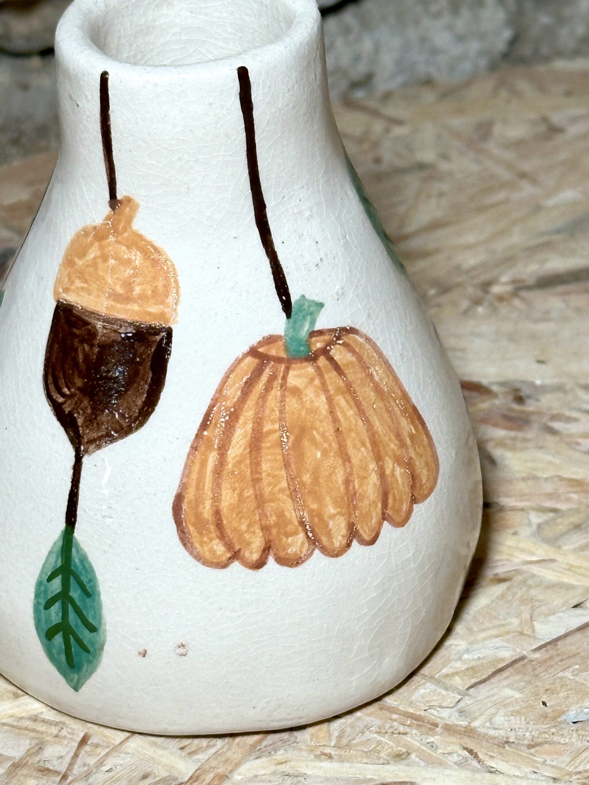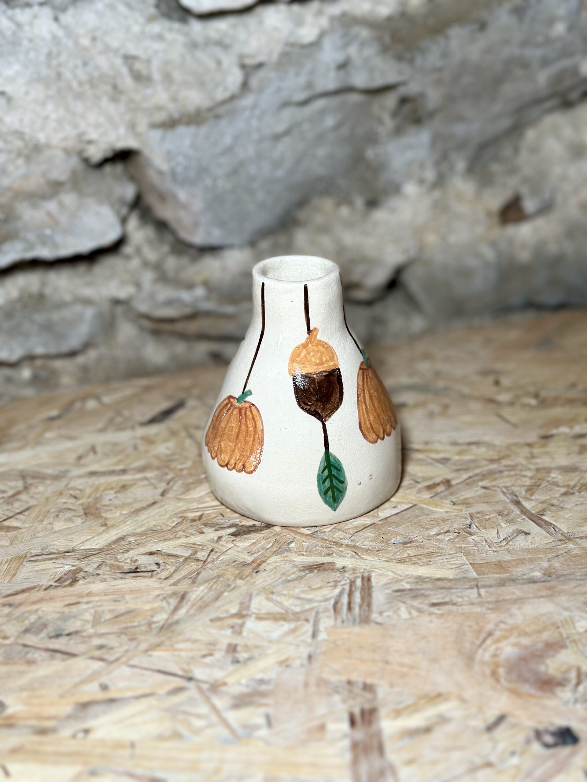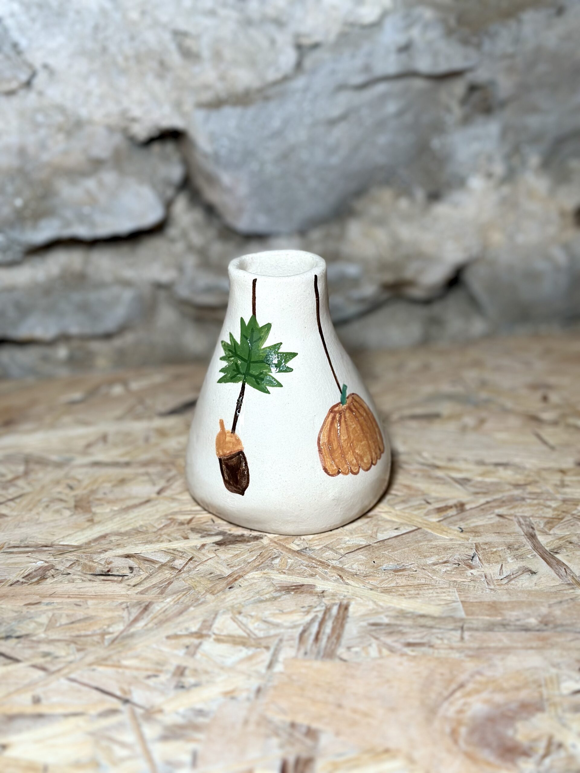 Le vase “d’Automne” est une création entièrement modelée et peinte à la main, célébrant la saison des couleurs chaudes et des petits trésors naturels.